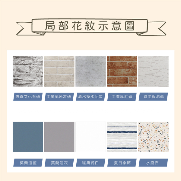 目前現貨:水磨石、米灰磚、文化石、清水模、純白,其他款式下訂3-5天出貨